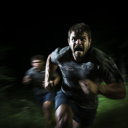 blurry trail cam photo, nighttime, of Danny devoto in a rugby polo turning into a werewolf