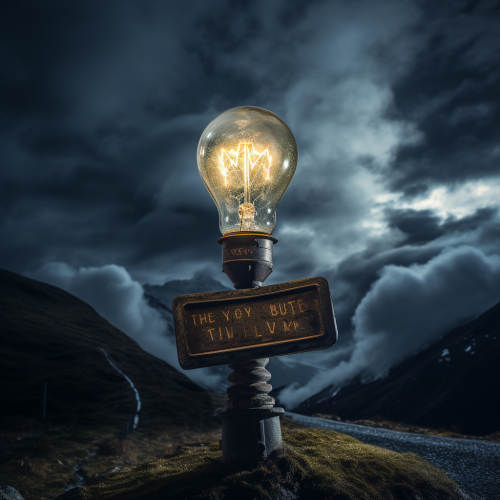 a 19th cenutry lightbulb on top of a road sign in the the english lake district, night, spooky atmosphere