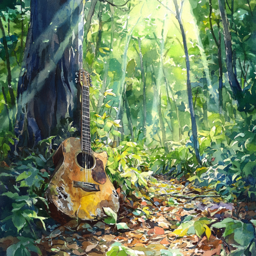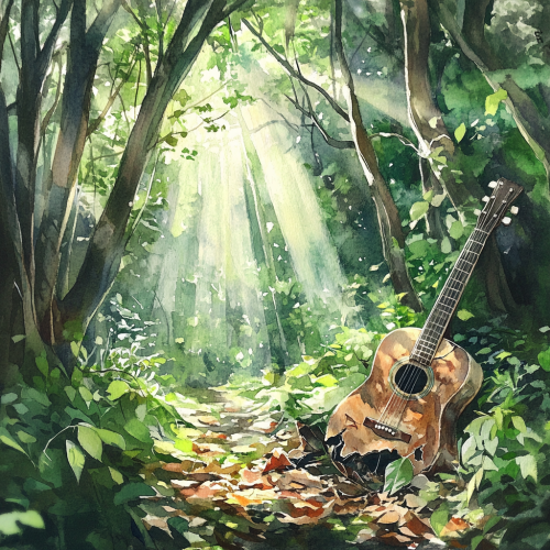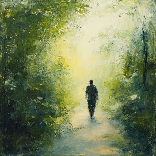 An experienced traveler walking through a lush, overgrown path, shrouded in soft, blurred brushstrokes. The scene is bathed in gentle sunlight breaking through the trees, casting shimmering light and shadows over the figure and the surrounding wilderness. The landscape appears dreamlike, with the forest seeming almost alive, its colors blending into each other. The traveler moves carefully, embodying wisdom and restraint in every step. --s 50 --style raw
