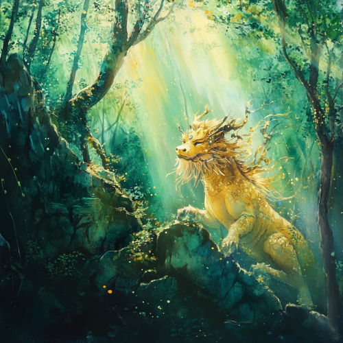 A vibrant painting of a Pi Xiu in a mystical forest, emerald green and shimmering, surrounded by ancient stones and misty light beams. Sunlight filters through the trees, casting a golden hue on the creature, blending traditional Chinese watercolor style with digital precision --v 6.1 --s 50