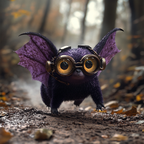 Small cute purple and black Halloween bat with pale yellow eyes, wearing steampunk goggles on its head, strutting down a dirt runway in the middle of an enchanted foggy Forest, fantastical, fantasy style, hyper detailed, 8k