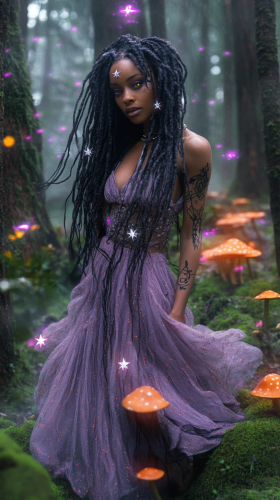 beautiful light skinned African American woman with green eyes and long black dreadlocks, wearing a modest, long purple dress with silver Stars, star birthmark, star jewelry and stars surrounding her, steampunk fashion, strutting down a mossy natural runway in the middle of an enchanted foggy Forest, many dark green fir trees, purple magic swirling, tiny orange mushrooms, extremely fantastical, surreal forest, fantasy style, hyper detailed, 8k --ar 9:16