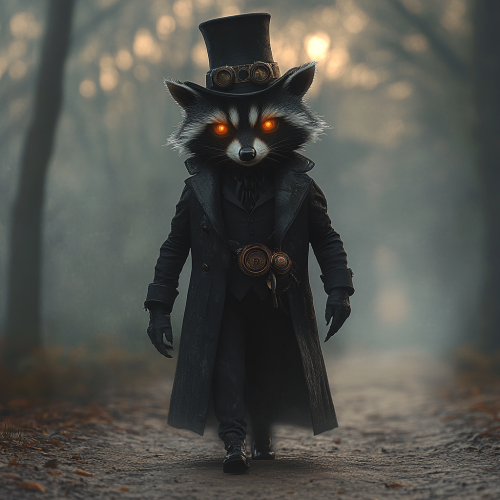 Halloween raccoon, black top hat , orange eyes, long black coat, steampunk fashion, walking down a dirt runway in the middle of an enchanted foggy Forest, fantastical, fantasy style, hyper detailed, 8k