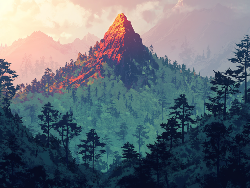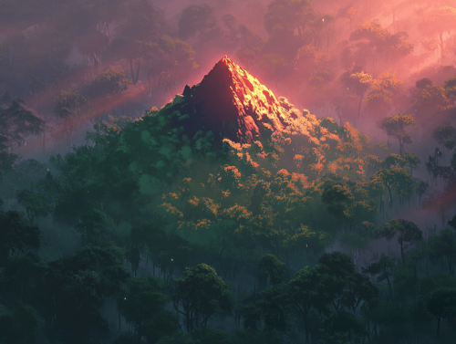 A tiny mountain peak in a vast forest. The forest is massive, vast, lush, thick, seemingly impenetrable, with no clearings. Many of the trees are big with thick dark stems. The forest has a mystical energy about it. A tiny mountain appears in the center. The mountain is colored red by a setting sun. Fantasy RPG setting, wide angle, detailed. --ar 4:3 --v 6.1