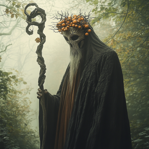 hyper-realistic photo Picture me of an ancient shaman standing in a mysterious misty forest. This sorcerer is a tall, dignified creature with a mask-like face with deep wrinkles, which contain wisdom and hidden power. His skin looks pale and ghostly, and dark shadows emphasize the contours of his face. The sorcerer is wearing a long robe of dark earthy color, and with a mixture of orange and red everywhere, he or she feels as if he or she has become one with nature. His or her head has twisted branches and a tall headdress decorated with small, shiny orange lanterns or fruits, giving off a mysterious glow. He or she holds a twisting wooden cane in one hand, symbolizing their deep connection to nature. Surrounded by dense, lush forest plants, soft mist spreads in the background, creating a surreal atmosphere.