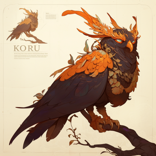 Koru (The Mysterious Owl Guide) • Inspiration: Drawing from wise but enigmatic characters like Howl’s Moving Castle’s Calcifer or the magical creatures in The Spiderwick Chronicles. • Design Notes: • Body Shape: Koru should have exaggerated, sharp angles and long feathers. His wings should be grand and sweeping, giving him an ethereal presence. • Eyes: Large and intense, glowing faintly to indicate his connection to the magic of the forest. His eyes should always seem like they’re seeing something beyond the physical world, contributing to his mysterious nature. • Feathers: Dark, with subtle patterns of light or symbols that glow faintly. His colors could be deep purples or dark blues, with hints of gold or silver to symbolize his knowledge of light and darkness. • Pose and Expression: Perch him on branches with a calm, composed stance. His head should often be tilted slightly, showing his wisdom and deep thought. --niji 6