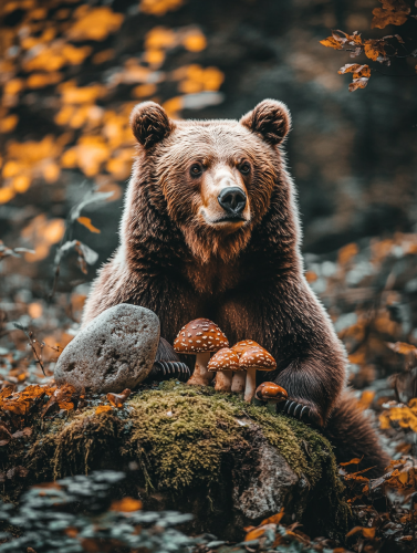 brown bear in the middle of autumn forest with moss, stones and mushrooms around him, whole image shoul be mystical atmosphere with pagan feeling --ar 3:4