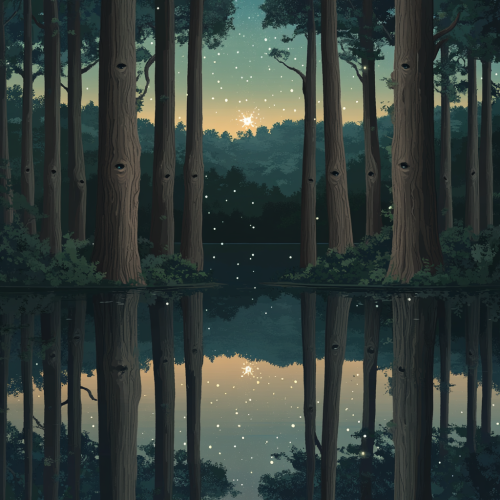 Create a 4K theater poster with a realistic, minimalist composition. Depict a tranquil forest scene where mythological characters are searching for a star, featuring a calm lake prominently in the foreground that reflects both the trees and the night sky above. Ensure each tree trunk visibly integrates small, realistic faces that seem to emerge naturally from the bark as poetic, subtle excrescences--gentle expressions woven seamlessly into the wood to add an understated sense of enchantment. The lake mirrors these trees and stars, creating a layered, dreamlike effect. Use soft, natural colors--muted greens, earthy browns, and cool blue tones--to evoke a serene, harmonious atmosphere. Prioritize the realism of the forest and lake, maintaining an uncluttered scene with the star as a focal point of mystery and wonder.