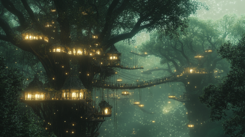 A magnificent elven city built within the towering trees of a vast, enchanted forest. Delicate, spiraling staircases wrap around the massive tree trunks, leading to glowing elven homes nestled in the branches. Suspended bridges made of woven vines connect the treetops, lit by softly glowing lanterns. Below, the forest floor is alive with bioluminescent plants and a soft mist that swirls through the roots. The atmosphere is vibrant yet serene, with a deep connection to nature and the stars above --ar 16:9 --v 6.1