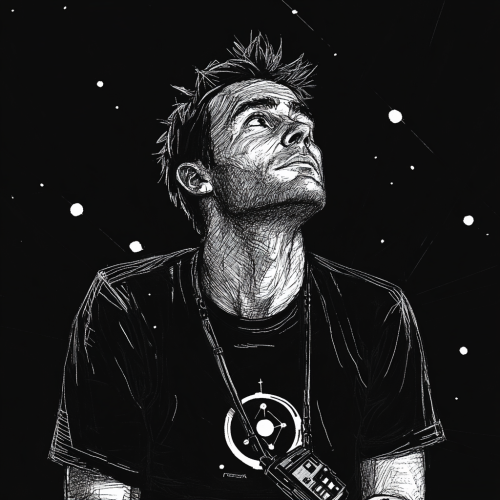 sketched portrait of an adult man with short messy slightly receding hair, wearing a 90s t-shirt with a meteor symbol logo on it, aged in her 30s, wearing a robotic remote control around his neck on a lanyard, clothing inspired by the clothing from the Alien movie franchise, sci-fi, on a black background in the style of John Berkey illustrations, small dots of dull sci-fi light and stars in the background, dark space, black and white, --v 6.1