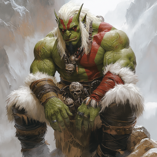 A muscular male orc with green skin, white fur, and red tribal tattoos, wearing an Asian-style outfit made of furs, sitting on top of a rock in a full-body shot, in the style of Frank Miller's comic book art.