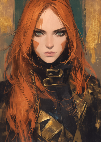 ginger, dune inspired, gothic style, futuristic female by artgerm with long with alien clothing with geometric and round shapes and orange markings geometric markings by mike Azevedo, masamune shirow, rafael grasseti, artgerm and drew tucker --ar 5:7 --stylize 750 --niji 6