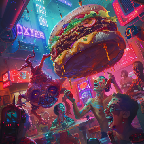 1980s Sci-Fi Art Style, detailed illustration, high contrast: A bewildered hero in a vibrant, over-the-top space diner, trying to bite into a comically large, floating sandwich that keeps dodging his attempts, surrounded by amused alien patrons laughing and pointing, with neon signs flickering and a retro jukebox playing humorous tunes in the background. The sandwich, adorned with antenna-like pickles and glowing cheese, seems to have a mind of its own, leading to a playful chase around the diner, much to the hero's chagrin and the entertainment of onlookers.
