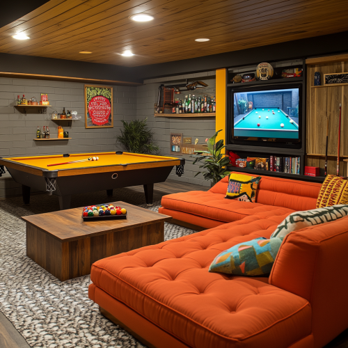 design a basement room, that has egress windows, that has a bar, bug screen tv, a couch/murph bed and pool table in mid century design style --s 250 --style raw