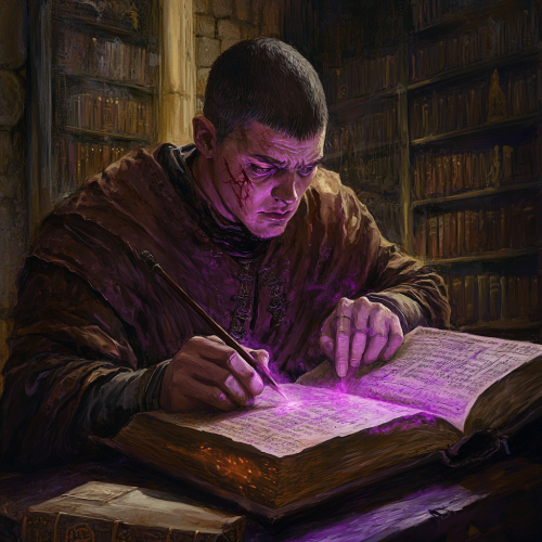 Realistic fantasy drawing of a young medieval monk scholar with a scar over his eye sitting at a writing desk in a crammed and cold castle library. His face shows fearful concentration while he writes purplish glowing letters with a worn quill into a large tome filled with demonic imagery. He is dressed in franciscan garb.