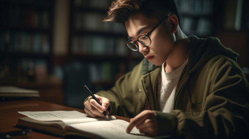 A Japanese high school student studying diligently at a desk in a quiet, well-lit classroom, surrounded by textbooks, notebooks, and stationery. The student has a focused expression, with their head slightly down as they write in a notebook. The room has traditional Japanese elements, like sliding doors and tatami mats, creating a serene and studious atmosphere. Soft sunlight filters through the window, adding warmth to the scene. Realistic and detailed, capturing the essence of dedication and concentration.