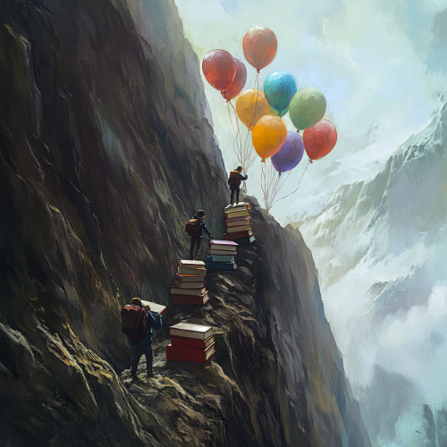 A steep, rocky mountain where most students are struggling to drag heavy, oversized books up the slope. Their faces show exhaustion and frustration, and their bodies are hunched over from the weight of the books, which are tied with ropes and being pulled laboriously behind them. In contrast, one student has several large, brightly colored balloons tied to their books, causing the books to float lightly in the air as the student walks effortlessly up the mountain. The glowing balloons make the journey easy, and the student appears relaxed and confident, while the other students struggle with their heavy loads.