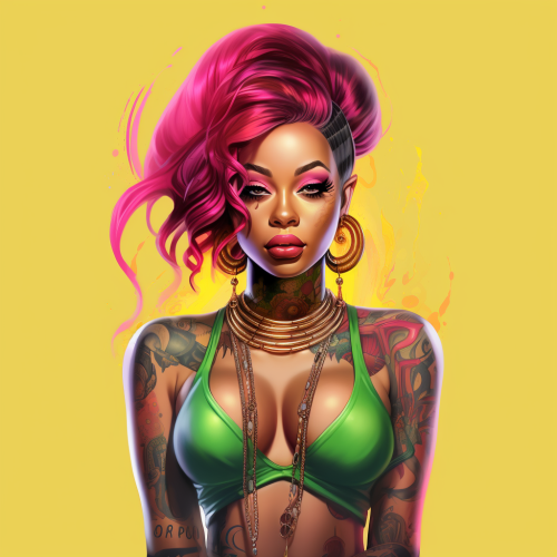 super gorgeous bad girl with tattoos, african american, hot pink, green , yellow, artistic, no background