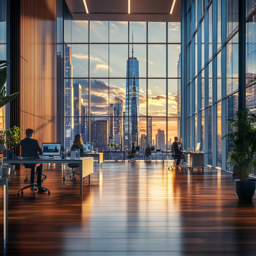 Create a hyper-realistic scene of a modern corporate office. The office features large floor-to-ceiling windows with a panoramic view of a city skyline during the late afternoon. Sleek, minimalist furniture including glass desks, ergonomic chairs, and polished wood floors reflect natural light. In the background, employees are quietly working at their stations, while one person stands near a digital smart board presenting. The lighting is soft yet crisp, with natural sunlight streaming in, casting realistic shadows across the room. Details such as potted plants, laptops, coffee cups, and office supplies are meticulously rendered to enhance the realism. The overall atmosphere feels calm, professional, and productive.--ar 9:16