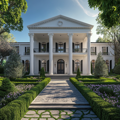 Holt mansion exterior, Georgian architecture, white columns, black shutters, manicured gardens, stone pathways, panoramic view, photorealistic, stunning, 8k, award-winning, dramatic