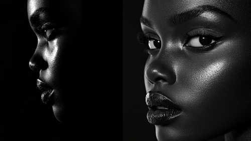 Perfect portrait of a Kenyan women, editorial, vogue portrait, studio professional photoshoot, black background, perfect skin texture, hyper detailed black and white portrait, hyper realistic, 4k --ar 16:9 --v 6.1