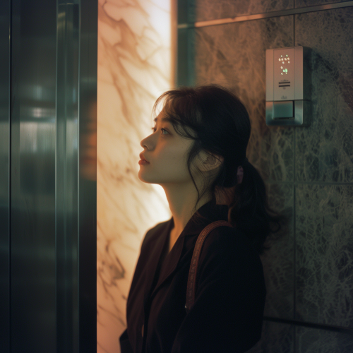 side view of an asian woman standing in front of a lift at the lobby in a 2023 modern luxurious hotel, 35 mm lens