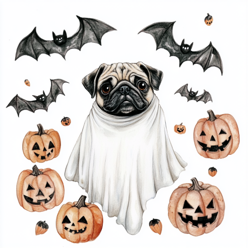 a watercolor hand drawn pug in a ghost costume, surrounded by various halloween themed elements, the dog is positioned in the center with a ghostly white sheet draped over it, surrounding the dog are pumpkins, some of which have carved faces, To the left and right of the dog are bats, one particularly large bat is flying above the dog. the design is isolated on a white background, the entire scene gives off a spooky and festive Halloween vibe
