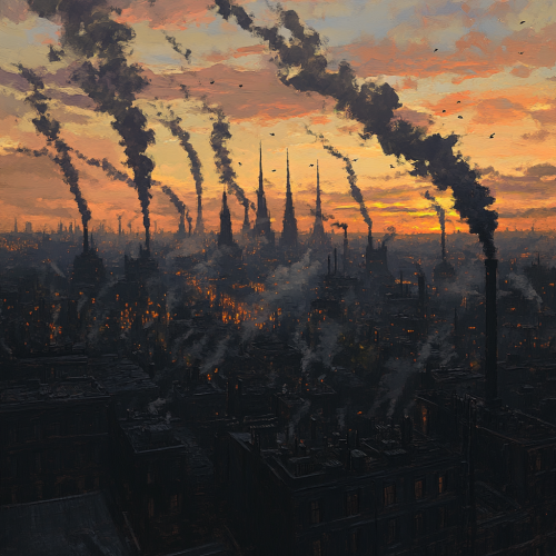 A view of the skyline at sunset, with squalid tenements in the foreground and gorgeous impossible spires in the distance. Many trails of smoke ascend into the sky.