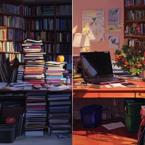 Floating objects with a modern, minimalist design, including a glass hourglass, sleek computer mouse, stylish pen, open notebook, and memo pad, all suspended in an airy composition, vibrant and saturated orange and pink tones, soft beige background, with subtle lighting and delicate shadows, creating a surreal and weightless atmosphere --ar 16:9 --v 6.0