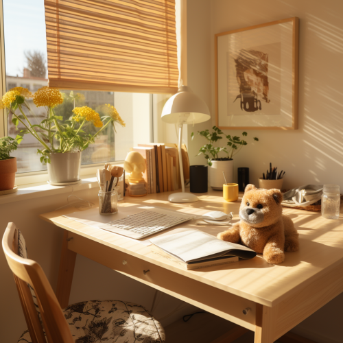 a minimalist danish designer's desk, sunray, aluminium venetian blinds and sunblind, till lighting, whimsical bear standing light on the desk, golden time, Cinestill 50D --s 250 --v 5.2 --weird 200