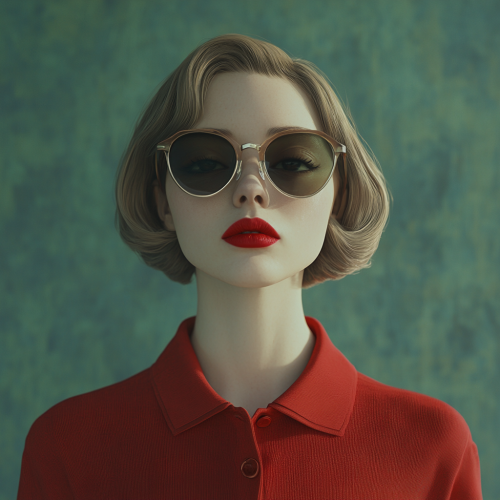 Surrealistic portrait of an androgynous woman figure with short hair, red lips, rayban sunglasses, wearing a red polo shirt, in the style of Giorgio de Chirico. The image has the aesthetic of a 90s anime still, with muted pastel colors and retro-style visual details reminiscent of the 1950s and 1980s. The overall effect is highly detailed and hyper-realistic.