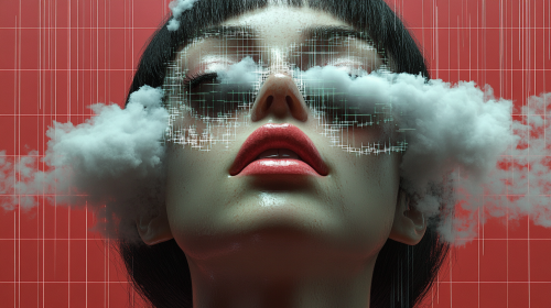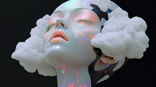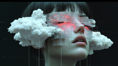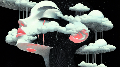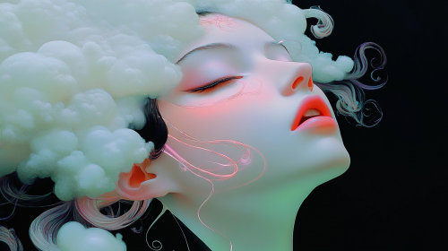 Surrealistic style, a woman's head is cut in half, with white clouds floating on the face and neck, obscuring her eyes and mouth, with simple shapes and lines, half-length portrait, iblack and green, the face is made up only of layered organic planes that appear to be floating above it, giving an illusionistic effect --ar 16:9 --sref 689229343::2 3154438697::1 2534928772::0.5 --sw 500 --stylize 1000