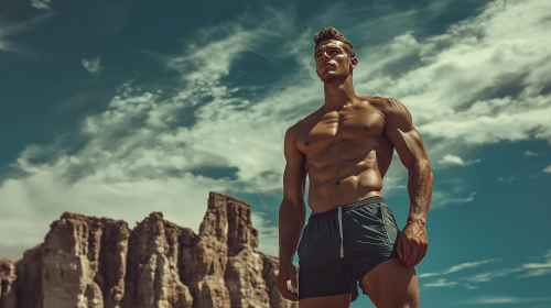 Dynamic sportswear photoshoot in a surreal Giorgio de Chirico setting, showcasing a rugged male model with a Fuji film vintage look --v 6.1 --ar 16:9 --q 2