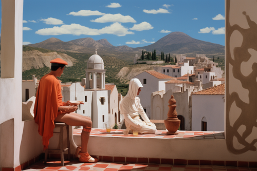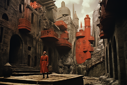 a production still of a live-action Giorgio de Chirico movie, Tropical medieval fantasy, 35mm --no camera --ar 3:2