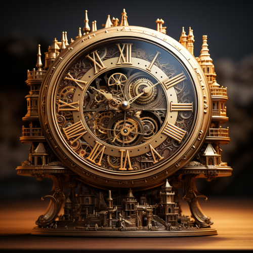 man standing in front of a clock. The clock is set to 11:11. The setting is surreal with a dreamy vibe. A small portion of the clock is fading to dust and the dust is drifting away in the wind.
