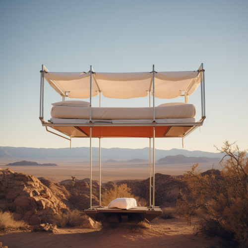 Surrealistic Photo of a beautiful woman standing on a small table. She is in the desert. The table is burning. Midriff showing. Firelight on skin and clothes. Camels and sheep --v 6.0 --s 1000 --ar 19:12