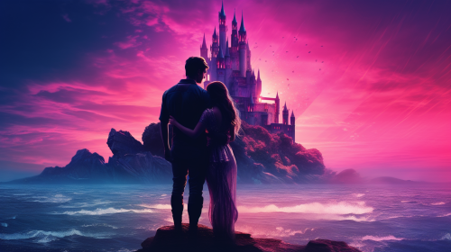 synthwave style art of man and woman embracing each other romantically on beach with epic castle in background. --aspect 16:9