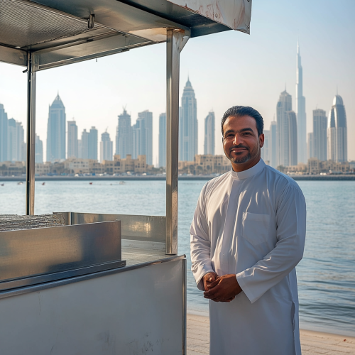 A worker is standing near Dubai's Marine Drive, with the famous skyline and waterfront visible in the background. The worker's face is clearly visible, expressing calmness and focus, with a warm smile on their lips. They are standing with hands clasped together in front of them. Beside the worker is a clear, empty stand, ready for customers to choose products. The warm afternoon sunlight reflects off the water, illuminating both the worker's face and the surrounding beauty of Dubai, creating a professional yet serene atmosphere.