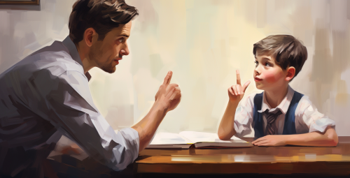 modern and annoying 6 year old boy is getting told off by his teacher in a classroom for bad grade. white walls and light color scheme ultra realistic --ar 200:102