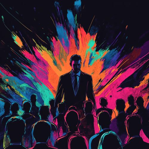 Generate a digital art for A digital art scene showing a confident leader standing before a team, answering questions. The background includes abstract representations of challenges, conflicts, and motivation. Use light gray as the primary color. --ar 2:1 --quality .5