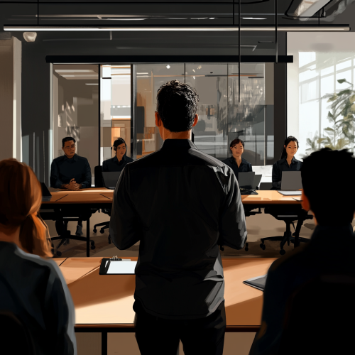 Generate a digital art for A digital art scene showing a confident team leader conducting a training session with new analysts. The background features a modern office setting with engaged team members. Use black as the primary color for the background elements, ensuring a sleek and professional look. --ar 1:1