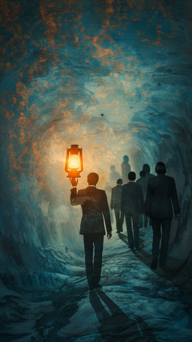 The Leader as a Coach, A figure holding a lantern aloft, illuminating the path for others following behind, portraying the leader as a coach guiding their team towards success --ar 9:16