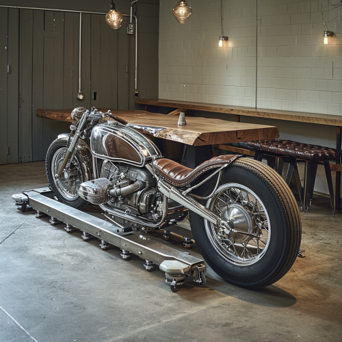 a motorcycle parked horizontally, There is a long footstool spanning the length of the motorcycle in front of it. And a dining table long enough for two people to eat on --v 6.0