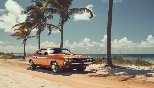 1972 Dodge Challenger on the beautiful beach, pine threes, beautiful light brown sand beach --ar 7:4 --v 6.0