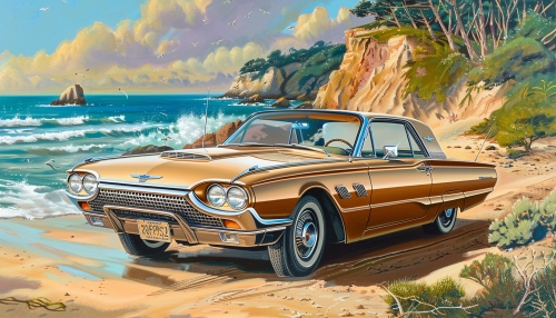 1932 blue Ford Highboy Roadster on the beautiful beach, illustration, --ar 7:4 --v 6.0