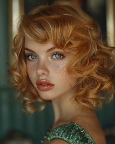 laura lancaster, 1950 tv, in the style of chie yoshii, gold and emerald, jessica drossin, timeless beauty, junglepunk, glitter, soft-focus portraits --ar 103:128 --v 6.0 --s 800