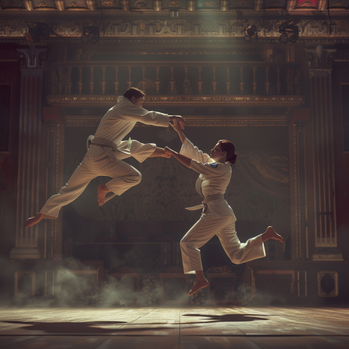 a man and a woman doing judo throws on a vintage theater stage, fading light, minimal setup, very detailed, 4k, cinematic stlye