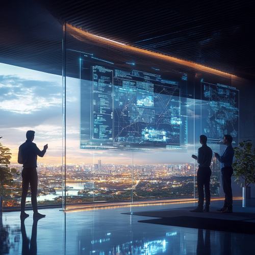 A sleek, modern office with a large glass window overlooking a city. On a digital screen, a detailed project timeline and strategy map are displayed. A team of professionals is discussing and pointing to the screen, showing teamwork and leadership. The environment is high-tech, with holographic displays and smart devices, symbolizing strategic planning and project management