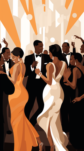 A group of black men and women, boys and girls dancing,at an upscale party, pertra eriksson art, vector art --ar 9:16 --v 5.2