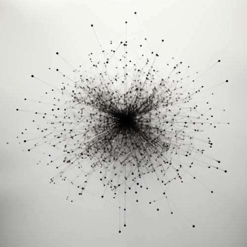 a black and white digital photograph of a growing network. This representing a growing community. Zoom into one node